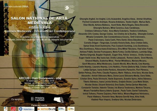 In perioada 16 septembrie- 01 octombrie 2019, la ARCUB- Han Gabroveni, o cladire de epoca minunat restaurata, are loc “Salonul National de Arta Medievala” editia a XIi-a. La vernisajul care se va desfasura in 19.09.2019 au participat criticul de arta Marius Tita, pictorul Raducu Marin- curatorul expozitiei, oameni de arta, totul invalui in acordurile muzicii medievale. Cei peste 200 de artisti care participa la eveniment expun lucrari inspirate din arta medievala bizantina, romanica si gotica si realizate intr-o mare varietate de tehnici (grafica, pictura, vitraliu, mozaic, tapiserie, sculptura etc). “In plina contemporaneitate rapelurile medievale sunt necesare. Ele sunt radacinile noastre, iar atunci cand vorbim de….Evul Mediu romanesc vorbim putin si despre noi cei de astazi.”- ac. Razvan Theodorescu