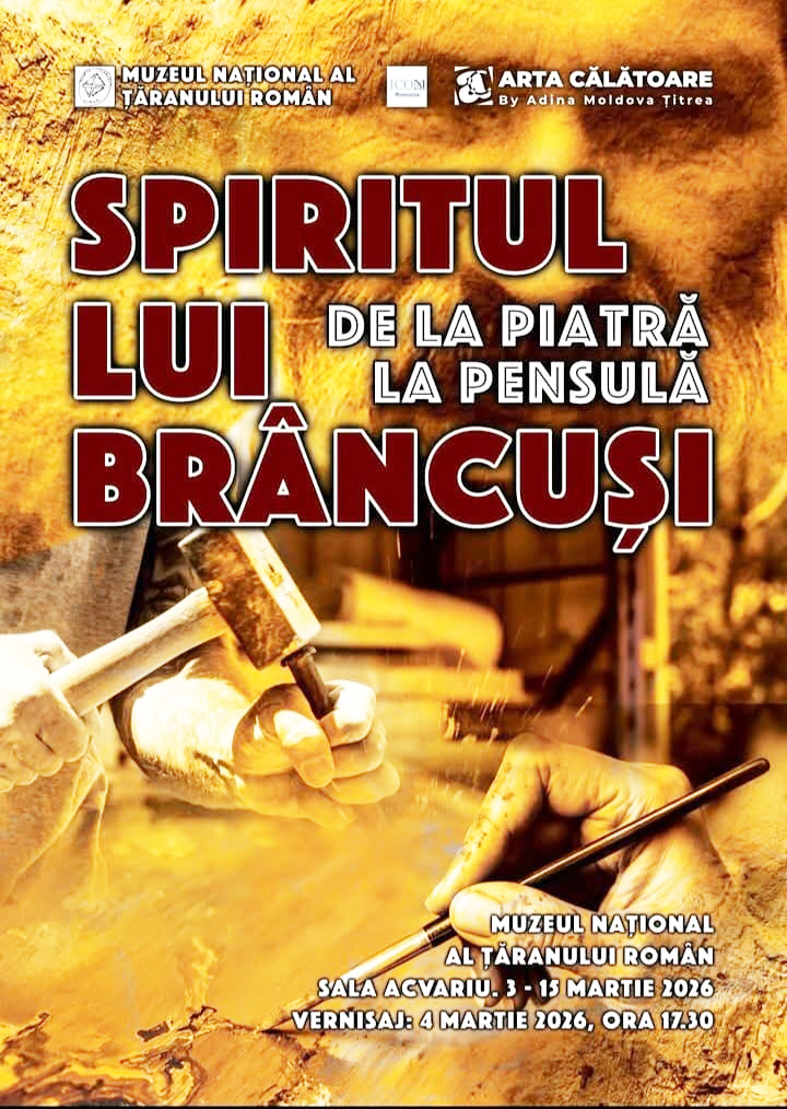 Expozitia de arta “Spiritul lui Brancusi- de la piatra la pensula”, curator Dna Adina Moldova Titrea, si-a deschis portile pe data de 03.03.2026 in sala Acvariu din Muaeul Taranului Roman din Bucuresti. Evenimentul foarte frumos organizat cu ocazia a 150 de ani de la nasterea lui Brancusi este prin tematica si abordare un omagiu adus celui ce a fost unul dintre cei mai importanti creatori ai artei moderne. Dupa cum spune si numele expozitiei lucrarile expuse au incercat sa prinda esenta si simplitatea operei brancusiene. Intr-o atmosfera incarcata de emotie, bucurie si sensibilitate, vizitatorii au putut admira lucrarile expuse in care autorii si-au exprimat sentimentele fata de opera marelui artist utilizand tehnici si teme diferite. Aici s-au putut vedea lucrari de pictura in ulei, acrilic, acuarela, sculptura, vitraliu, arta decorativa, panotate fluid, cu gust pentru un maxim de effect artistic.