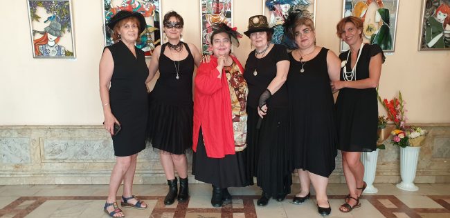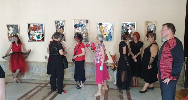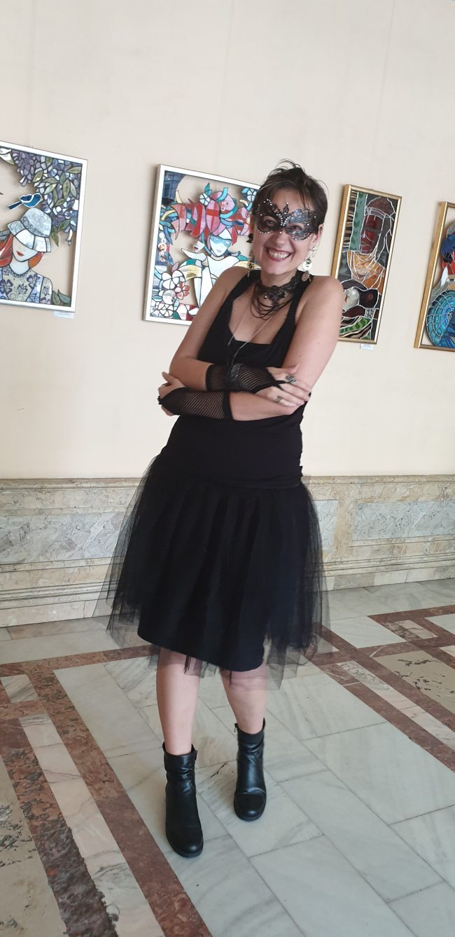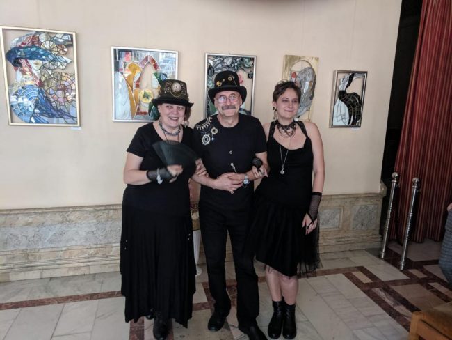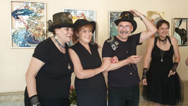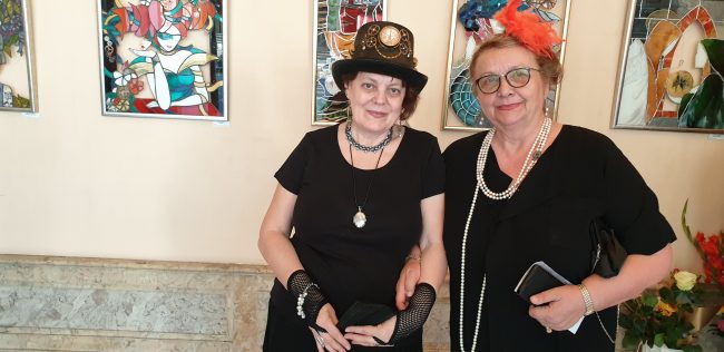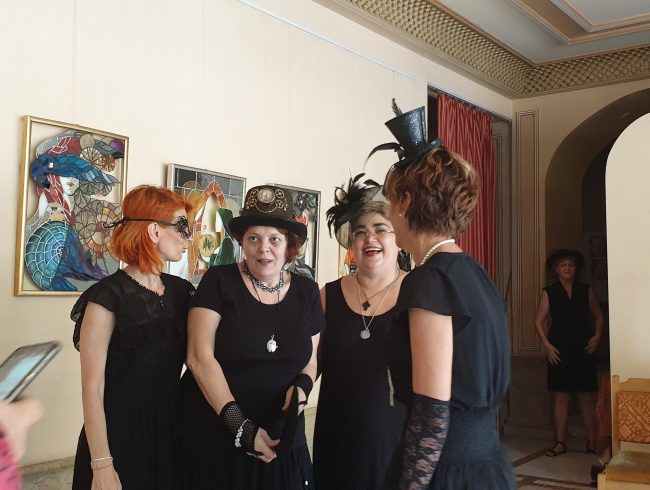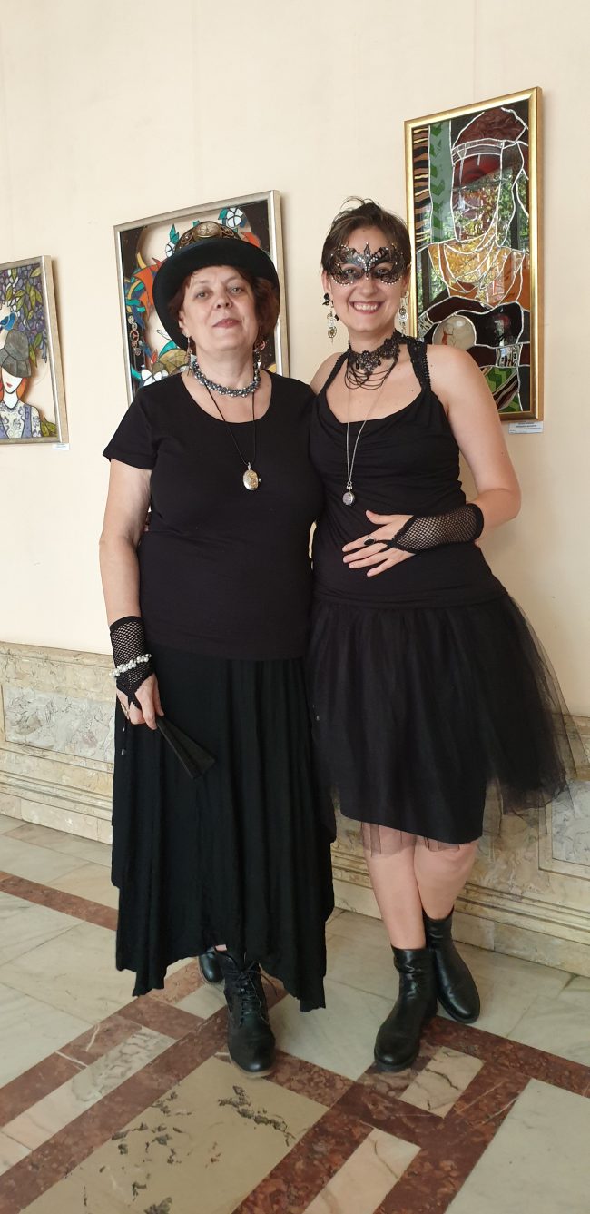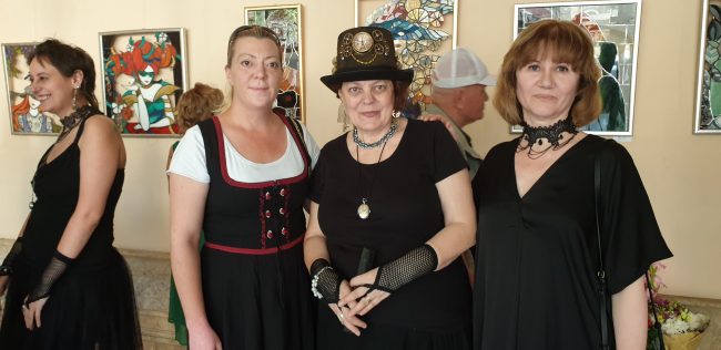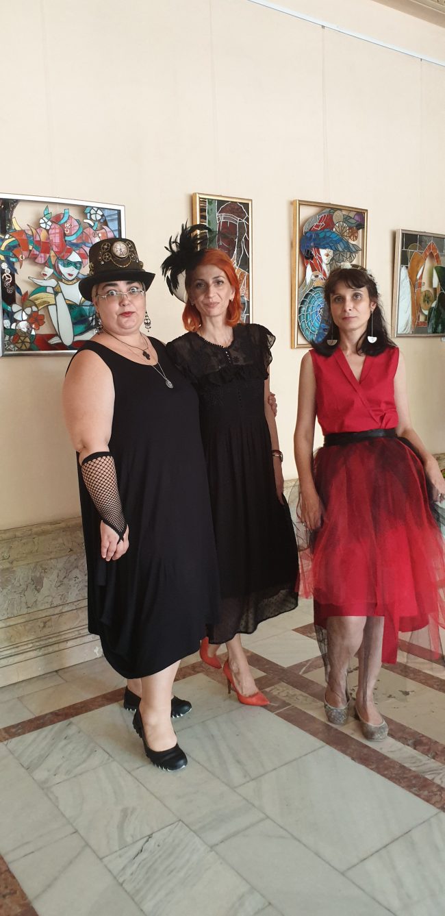 Expozitia personala “Femei si ingeri”,expozitie de vitralii altfel, e gazduita de Galeria Foaier a Cercului Militar National in perioada 25 iunie- 08 iulie 2019. Vernisajul din data de 26 iunie a cuprins o scurta prezentare a expozitiei si un minirecital al actritei Doina Ghitescu. Participantii au fost rugati sa se imbrace astfel incat sa sugereze moda Ghotic- Steam punk culorile acceptate fiind negru, rosu sau violet cu accesoriile de rigoare. Tablourile cu teme delicate, in culori vii au contrastat placut cu imbracamintea preponderent neagra. A fost un vernisaj vesel vizionarea tablourilor amestecandu-se cu placerea provocata de minibalul mascat.