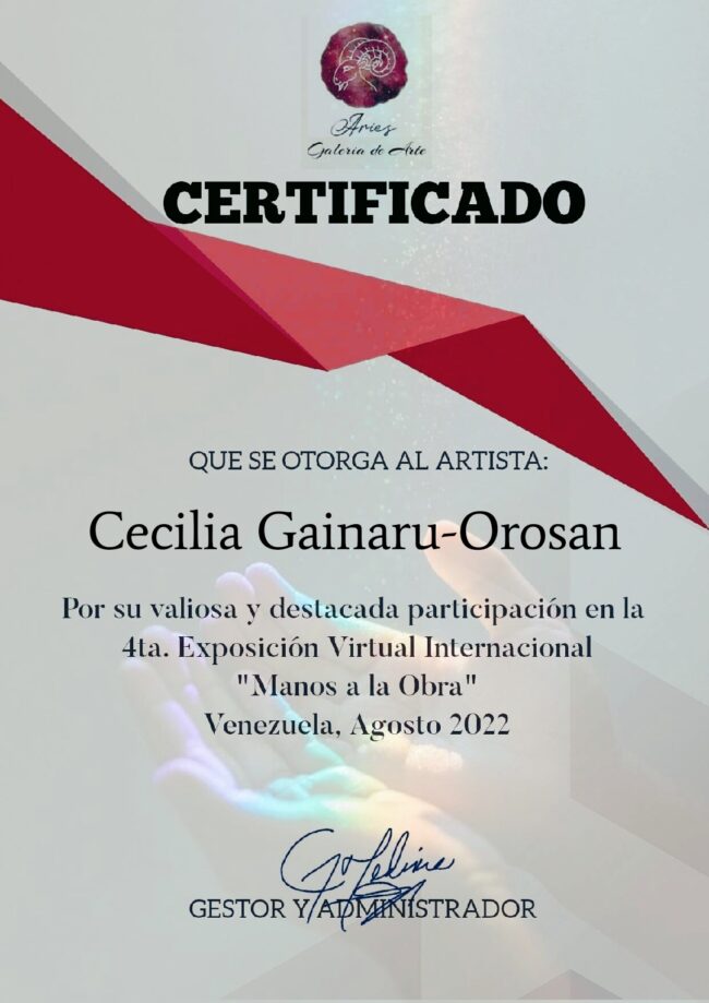 “Manos a la Obra (Let’s Do It)” este o Expozitie internationala virtuala ajunsa la a 4a editie si este organizata si promovata de Galeriile de Arta Aries din Venezuela. Expozitia a fost inaugurata in data de 28 august si poate fi vizitata pe platforma galeriei de arta. De asemenea s-a tiparit un catalog online cu datele si imaginea participantilor care in plus au primit o diploma de participare